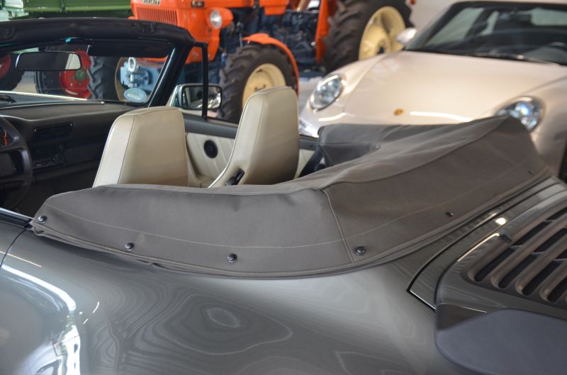 Das elektrische Verdeck arbeitet einwandfrei und die Zapfen verriegeln direkt und ohne Versatz, der Stoff befindet sich in gutem Zustand, die Spannung ebenfalls. Alles zeigt sich nahezu ohne Verschleiß.